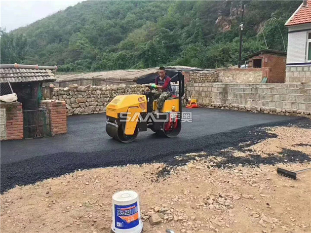 座駕1噸振動壓路機,遼寧施工現場,山底下面的空氣顯得格外的清新,炎熱的夏季了,看著這一片綠油油的樹林,心情也舒暢了很多,薩奧座駕振動壓路機還你一片整平的瀝青柏油大陸!