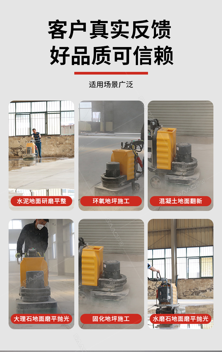 產品用途Product Usage: 其廣泛用于混凝土地面、石材地面的研磨、拋光,終達到舊地面翻新、新地面無塵的效果。 如:地坪研磨、水泥糙地打磨、舊環氧地坪翻新、密封固化地坪拋光。