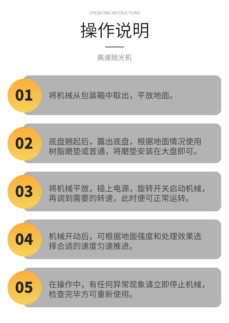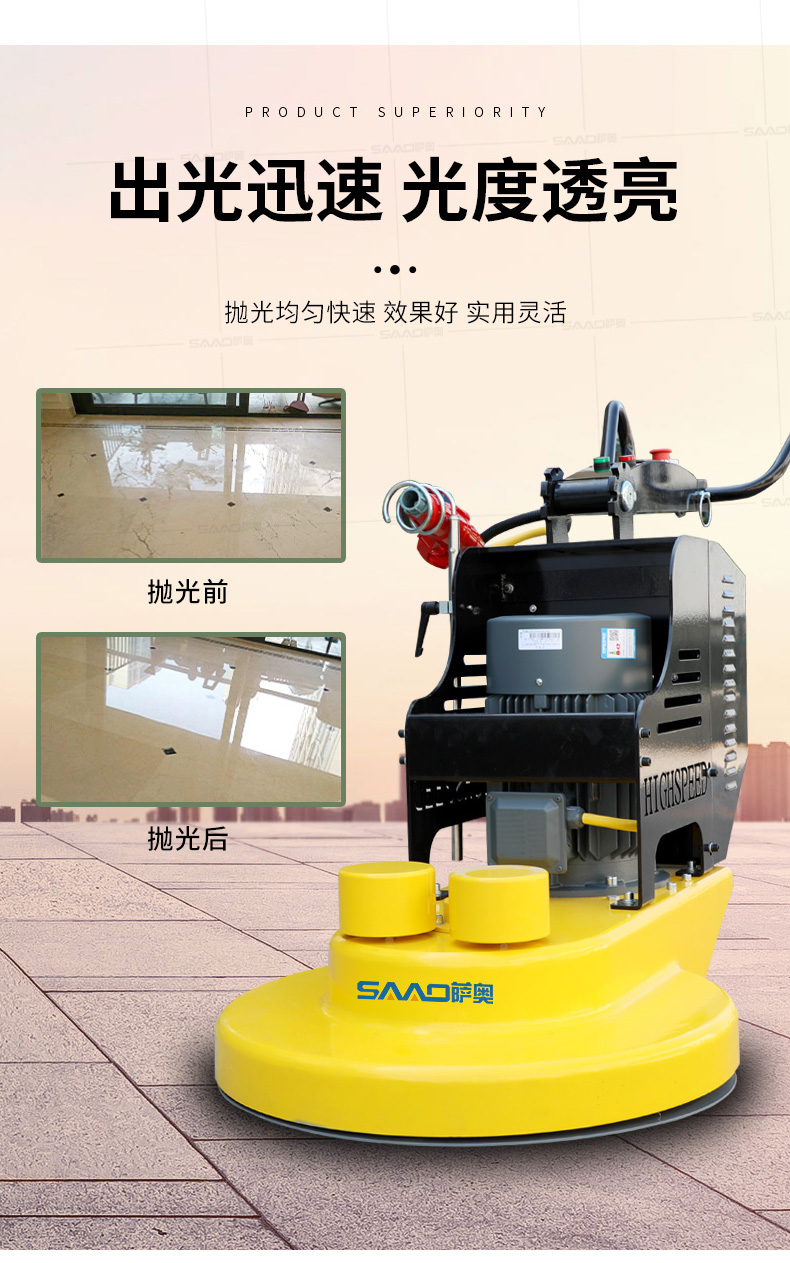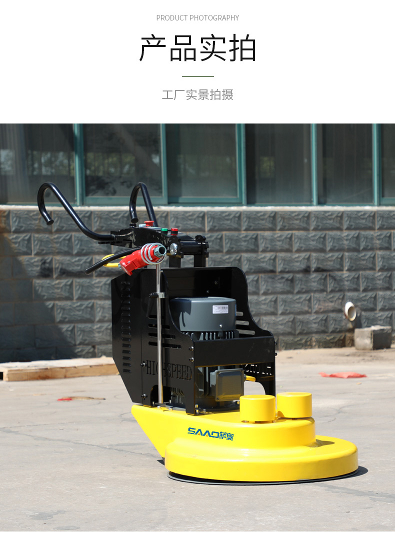 產品介紹: 高速拋光機是最具有競爭力的地坪機型系列。長期占據可觀的市場份額。其廣泛用于固化地面,石材地面的拋光,最終使得地面產生高潔,持久的光澤。 產品展示圖: 產品