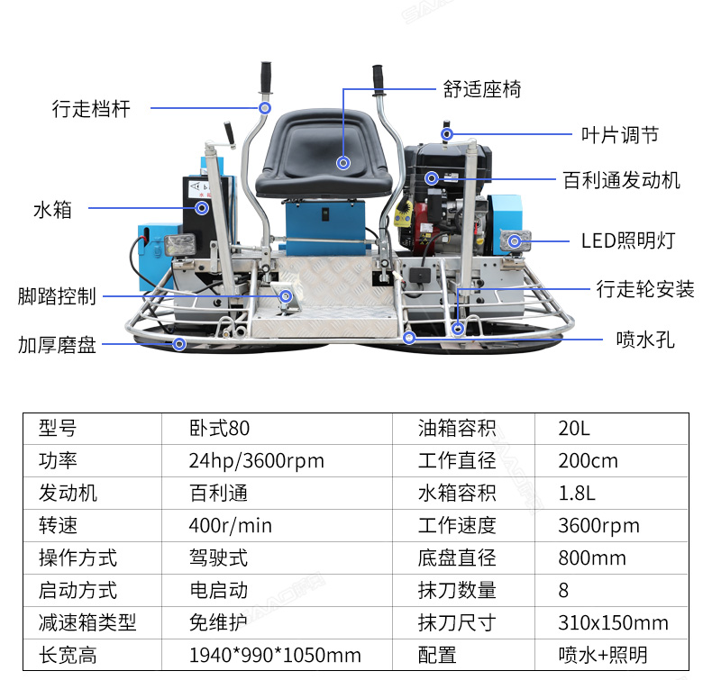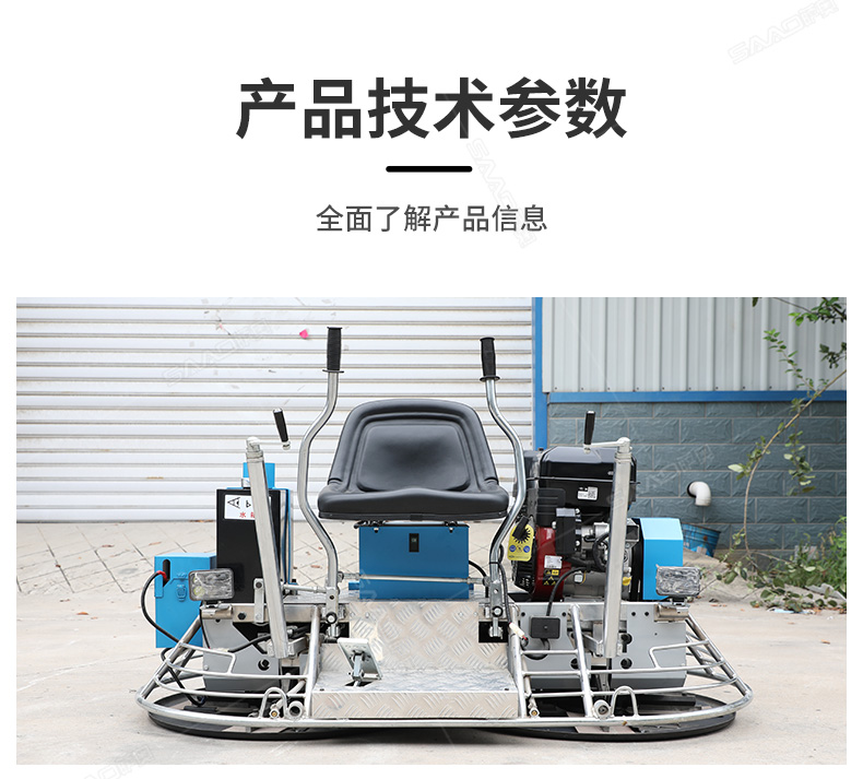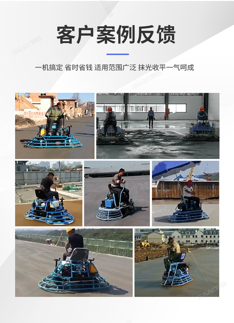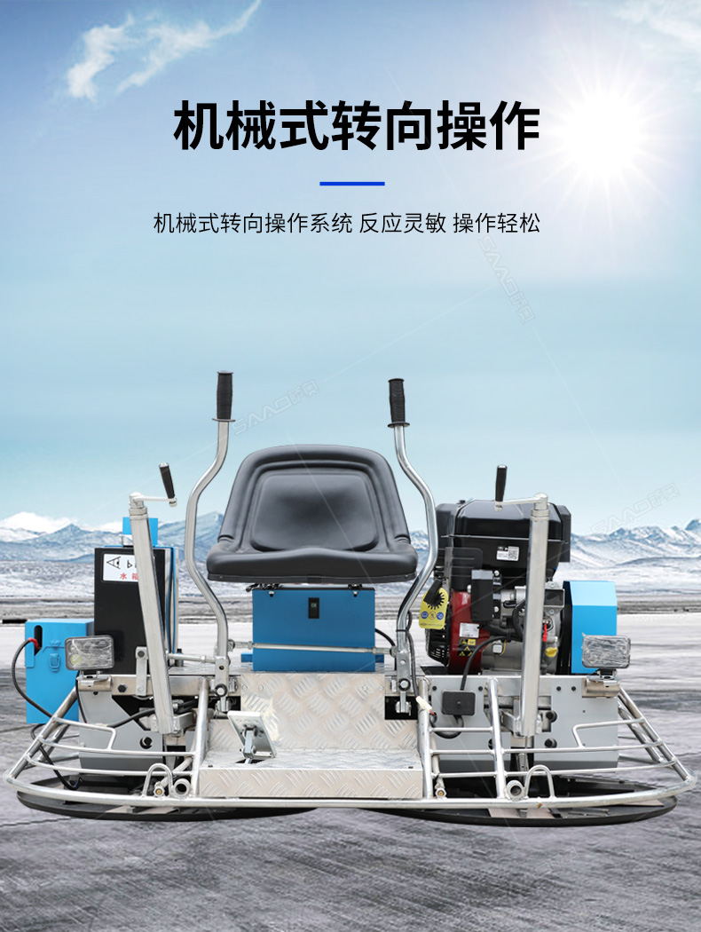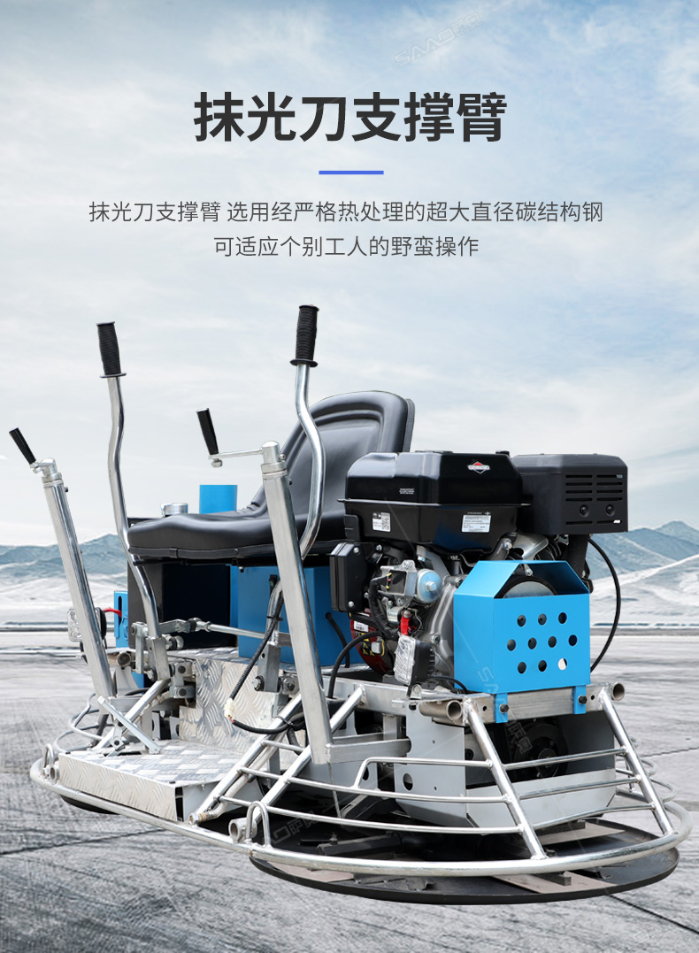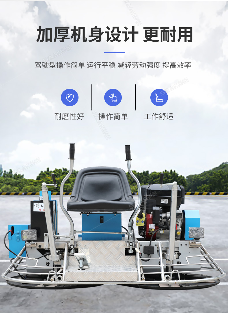 【產品介紹】 座駕式抹光機用于混凝土地面的提漿、壓實、抹平、抹光,座駕式操作大大降低了操作者勞動強度,提高了作業效率。 【產品優勢】 1、一機搞定省時省錢,適用范圍廣泛