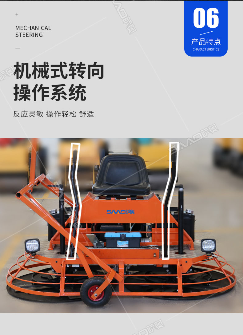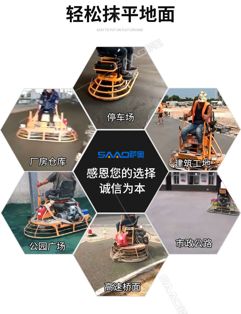 概述:用于混凝土地面的提漿、壓實、抹平、抹光。相對于手扶式抹光機,效率極高。