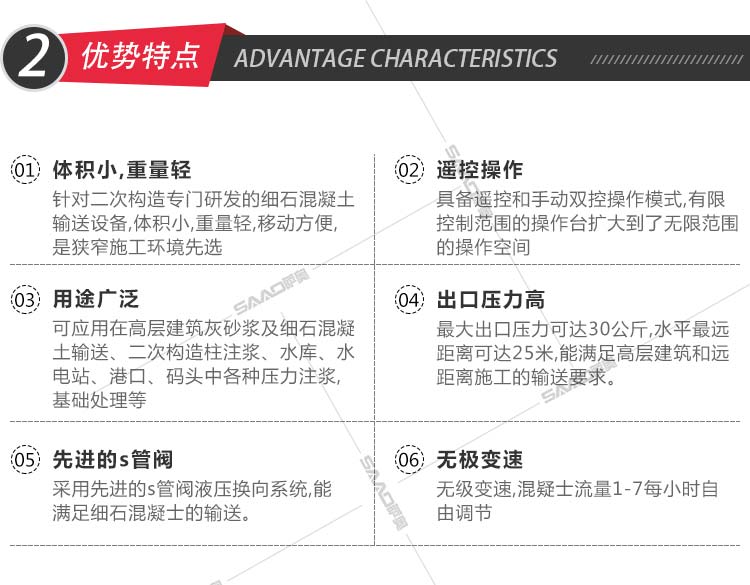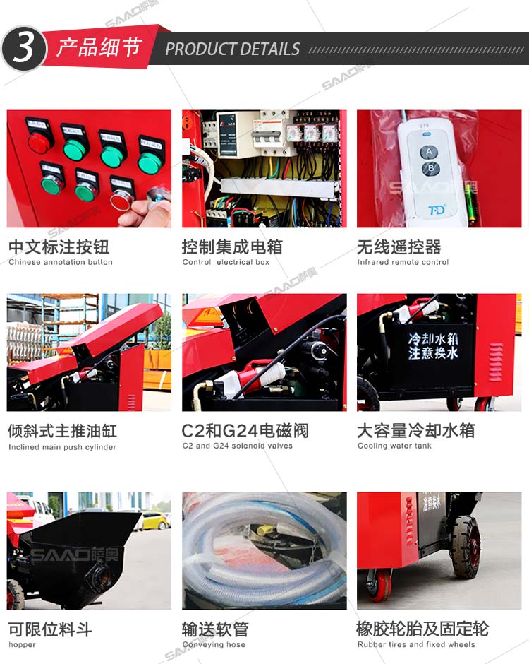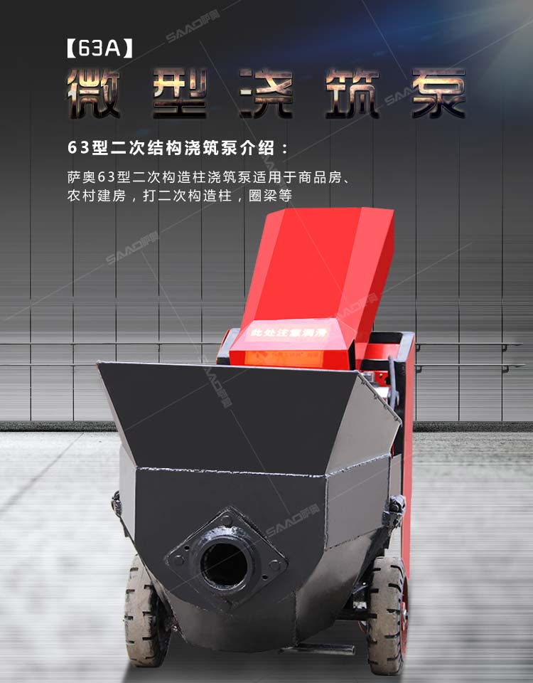 薩奧63型二次構造柱澆筑泵適用于商品房、農村建房,打二次構造柱,圈梁等,是您澆筑的好設備。電機功率小,體積小,重量輕,料斗可升降,真正能提高您的施工效率,是人工澆筑的幾十倍。