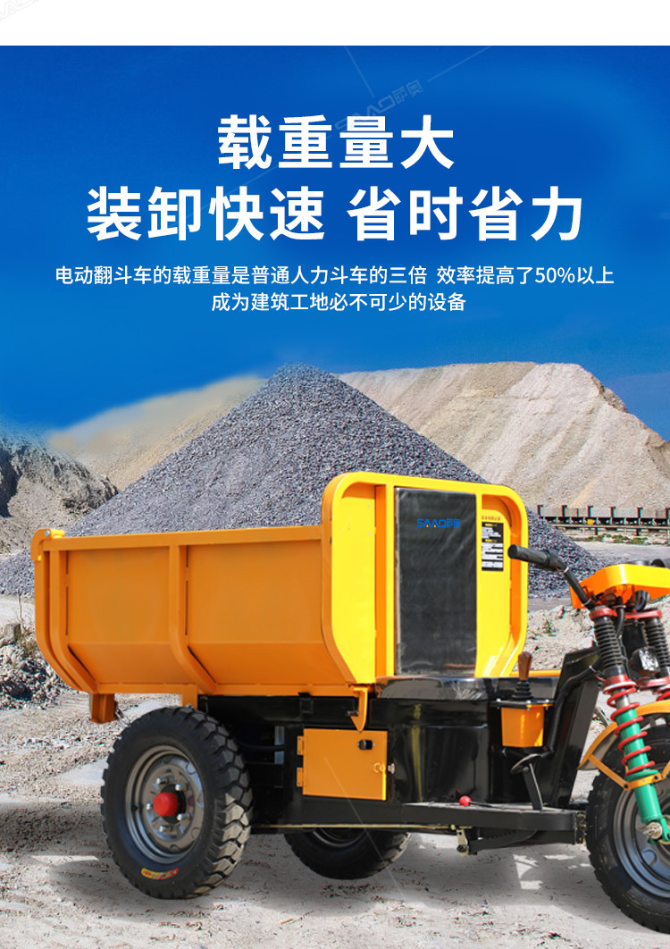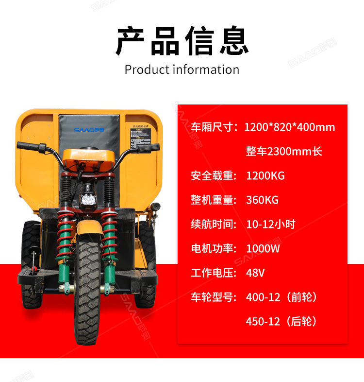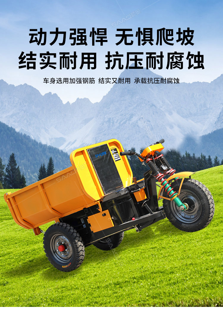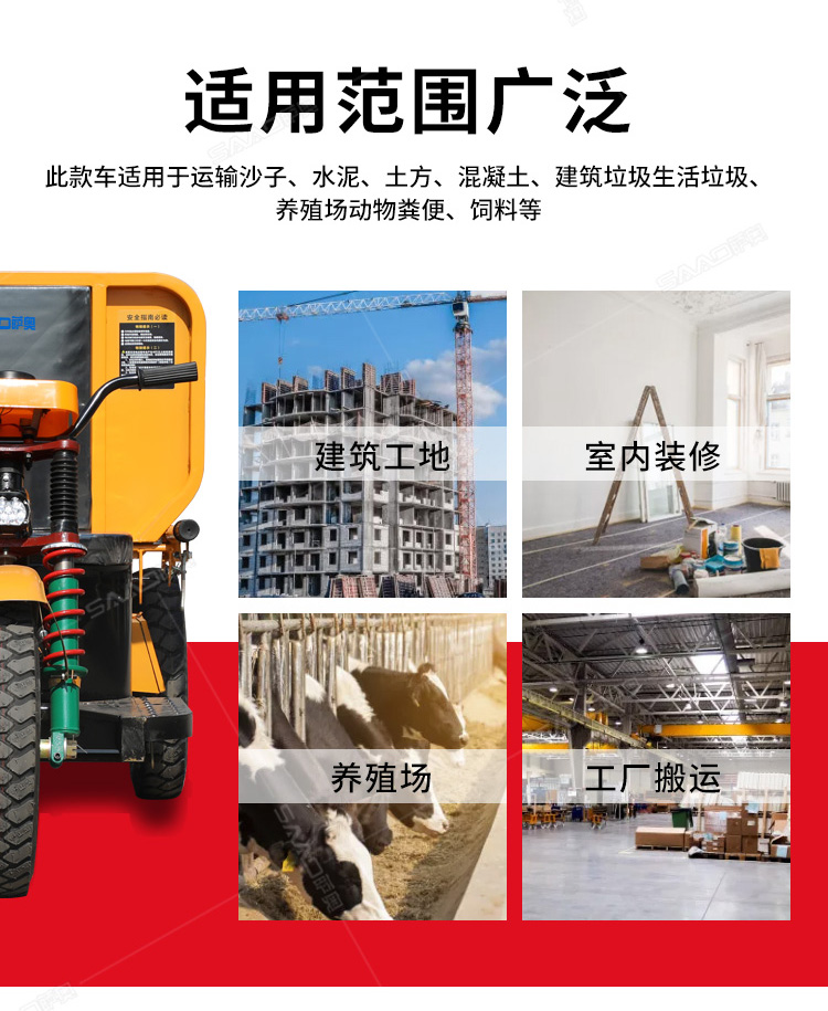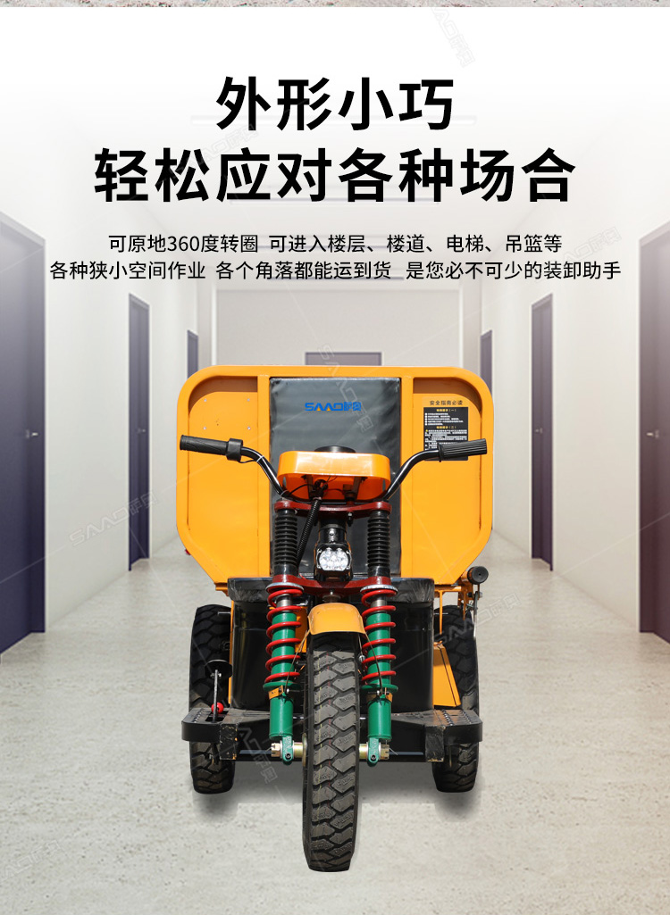 此款車適用于建筑工地、室內裝修、養(yǎng)殖場、工廠等場所,運輸沙子、水泥、土方、混凝土、建筑垃圾生活垃圾、養(yǎng)殖場動物糞便、飼料等,體積小操作簡單靈活,可原地360度轉圈,可