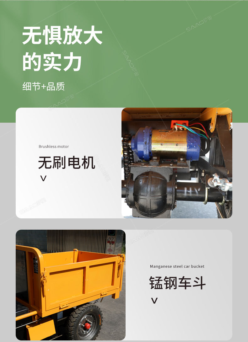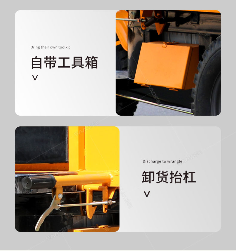 此款車適用于建筑工地、室內裝修、養殖場、工廠等場所,運輸沙子、水泥、土方、混凝土、建筑垃圾生活垃圾、養殖場動物糞便、飼料等,體積小操作簡單靈活,可原地360度轉圈,可