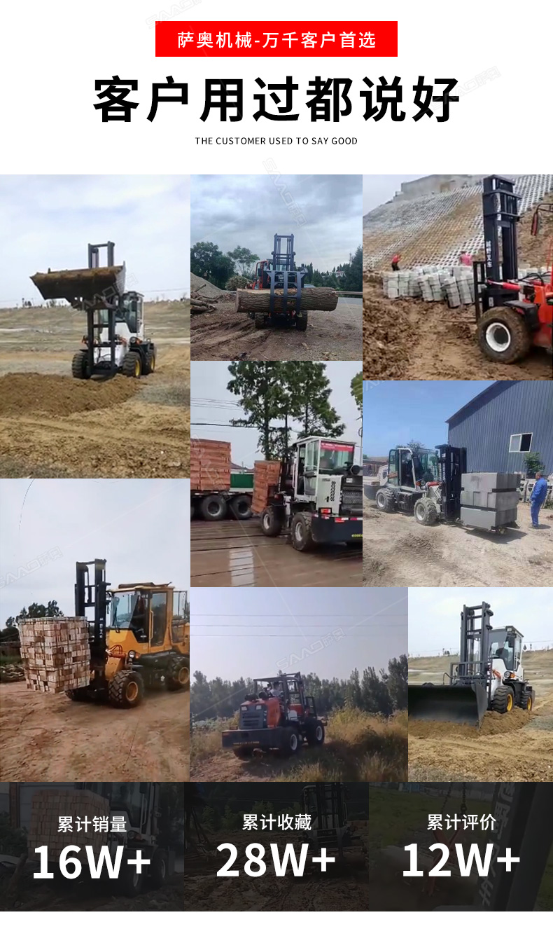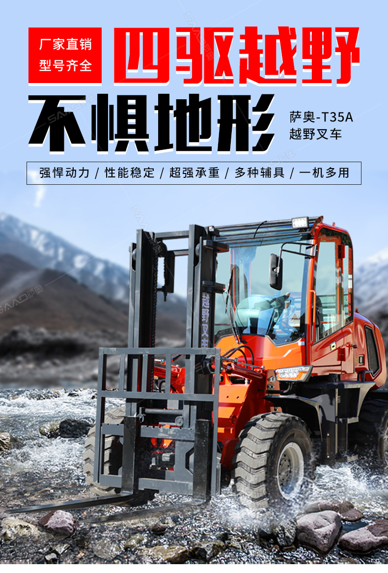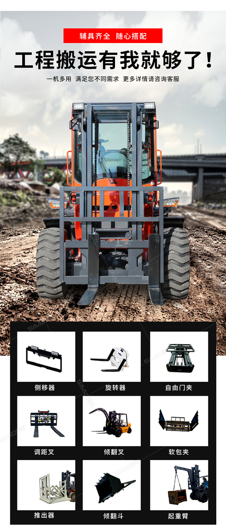 越野叉車可以在坡地和不平地面上進(jìn)行貨物裝、卸、堆垛及搬運(yùn)作業(yè),具有良好的機(jī)動(dòng)性、越野性可靠性。其功能多樣,可搭配側(cè)移器、調(diào)距叉、旋轉(zhuǎn)器、軟包夾、推出器、側(cè)翻叉、側(cè)翻斗、起重臂等工具完成不同的工作。