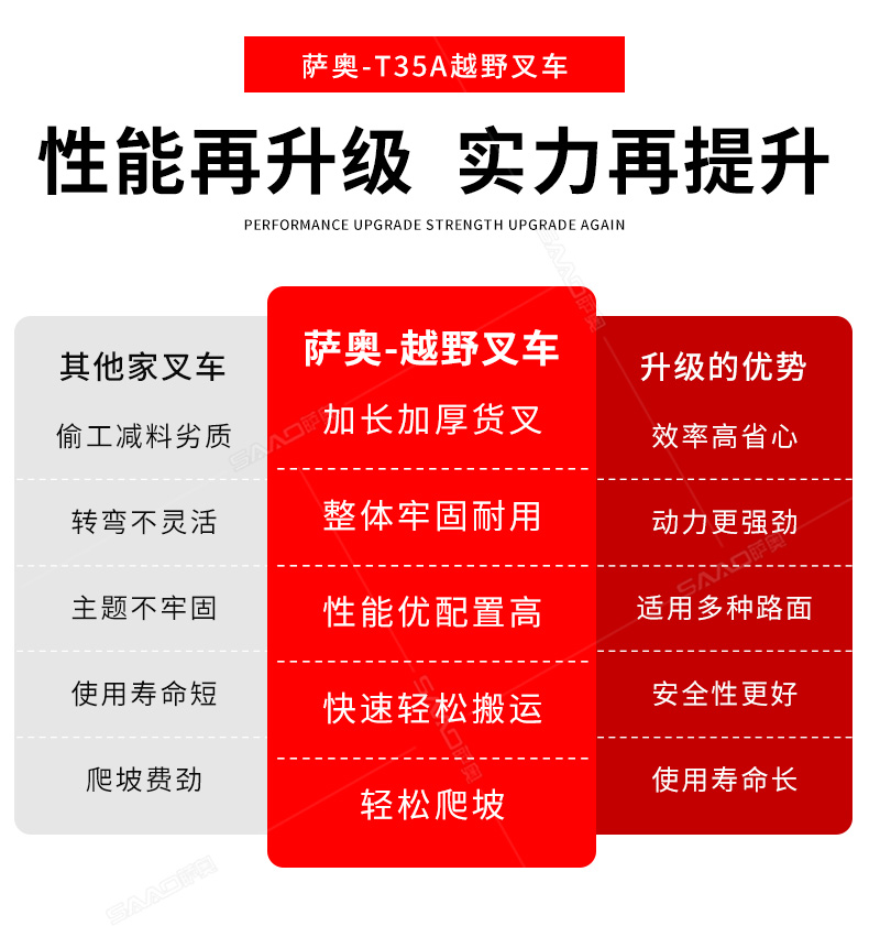 3.普通叉車只能在平整的路面上作業(yè),而越野叉車既可以在普通路面上作業(yè),還可以在山路泥路崎嶇道路作業(yè),輪胎抓地力強(qiáng),不打滑。