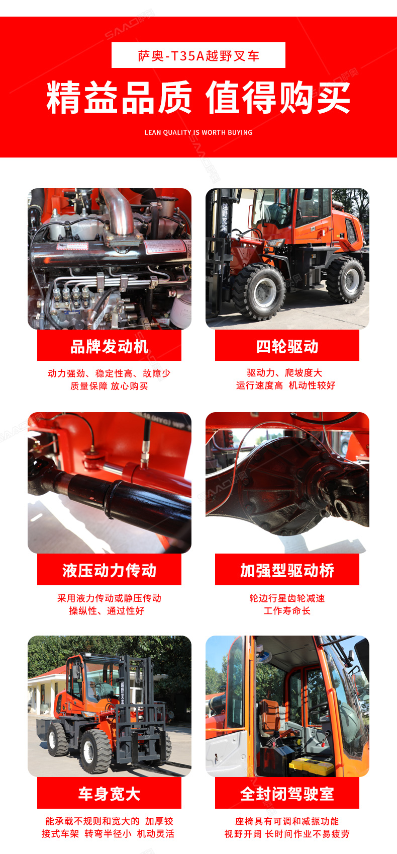 9.越野叉車杰出的離地間隙,特制的越野輪胎。前橋帶防滑差速裝置的四輪驅(qū)動(dòng)。使發(fā)動(dòng)機(jī)與變速箱之間上設(shè)計(jì)的更加緊湊。能夠在惡劣的地區(qū)如崎嶇地形,沙地和泥地上作業(yè)。