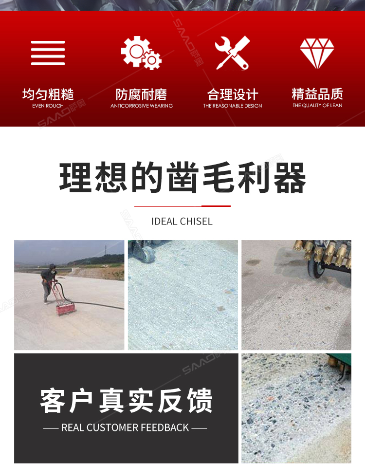 薩奧11頭鑿毛機 11頭鑿毛機的鑿頭有11個,它的鑿毛能力是指混凝土強度在C30-C40之間的參考 值,根據施工混凝土強度和鑿毛頭的鋒銳程度的不同,鑿毛效率會有所區別