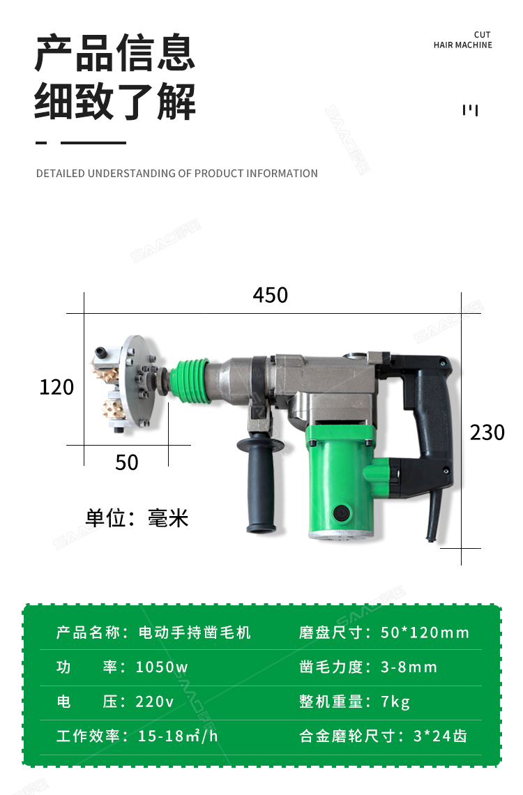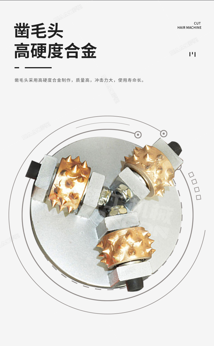 電動(dòng)手持式鑿毛機(jī) 金剛石三頭鑿毛設(shè)備 小型水泥路面拉毛機(jī) 功率:1050w 工作效率:15-18㎡/h 電壓:220v 磨盤(pán)尺寸:50*120mm 合金磨輪尺寸:3*24齒 鑿毛深度:3-8mm 整機(jī)重量:7kg