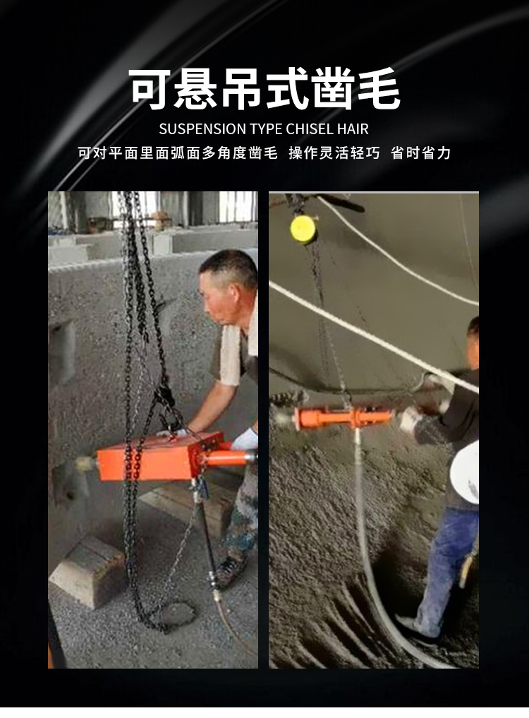 手持式懸掛鑿毛機(jī)機(jī)身有吊環(huán),鑿墻面的話吊起來使用,對平面、立面、弧形等多角度進(jìn)行鑿毛作業(yè),打擊力大、鑿深自如,應(yīng)用領(lǐng)域非常廣泛,又省力還方便。