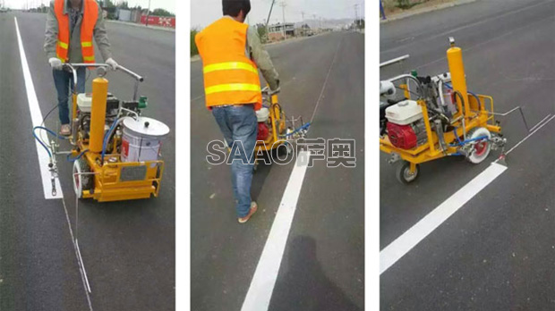 手推式冷噴劃線機為高壓力等流量型無氣噴涂機,該機利用汽油機驅動液壓系統帶動單柱塞泵,使涂料在機內形成高壓進行噴涂,所劃線厚薄均勻邊角齊