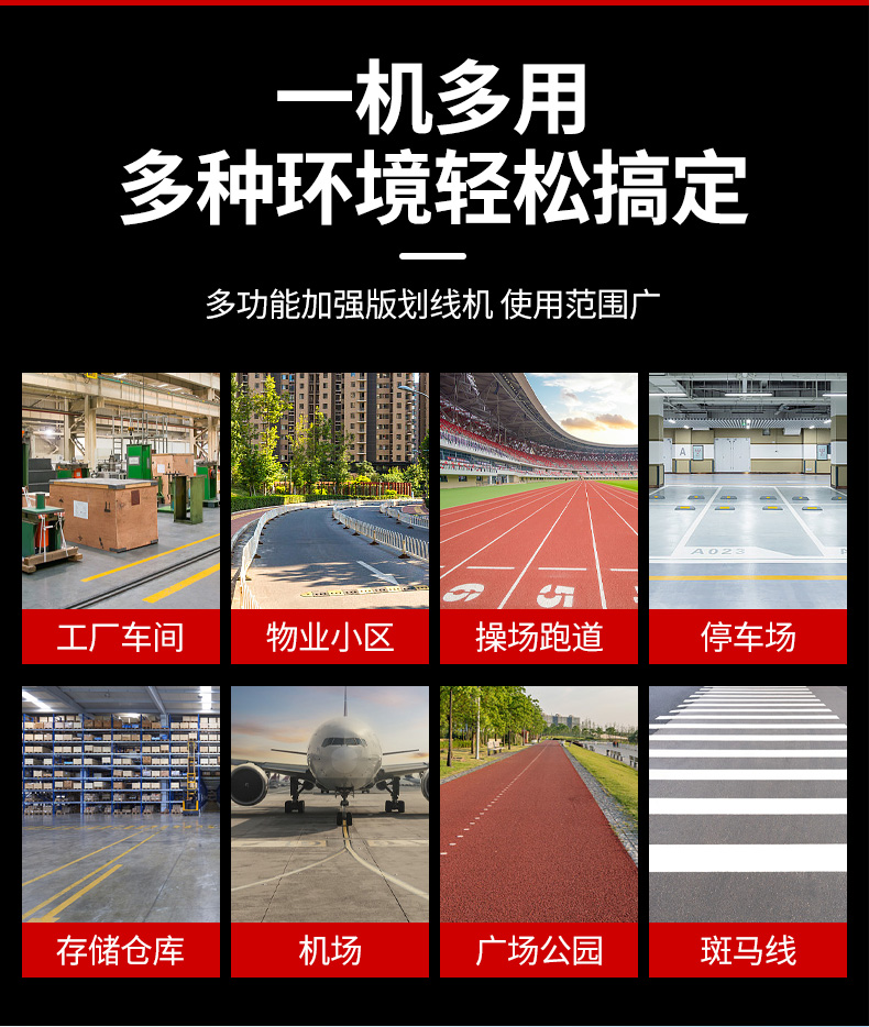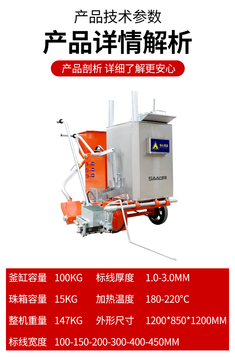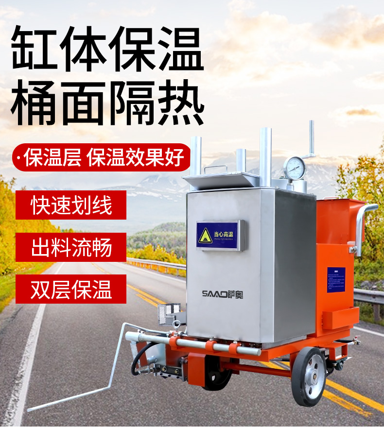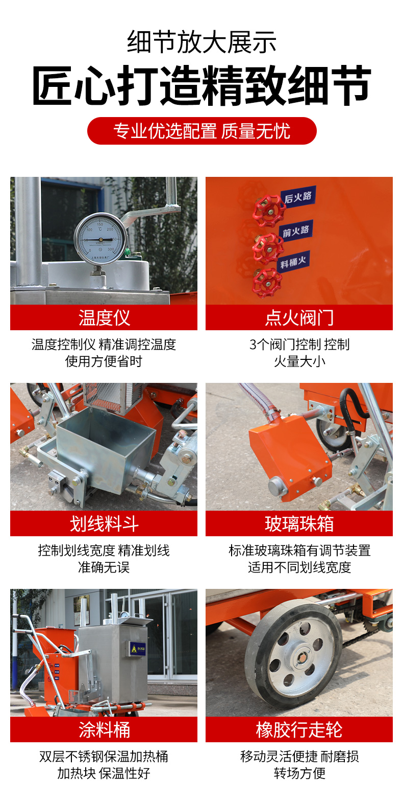 一:產(chǎn)品用途 多功能熱熔劃線機(jī)是我公司根據(jù)市場需求,獨(dú)立研發(fā)生產(chǎn)的一款新型劃線機(jī),該機(jī)集熔料與劃線一體,可獨(dú)立完成各類線型的施劃。對工程量較小零散復(fù)雜的停車位、場區(qū)