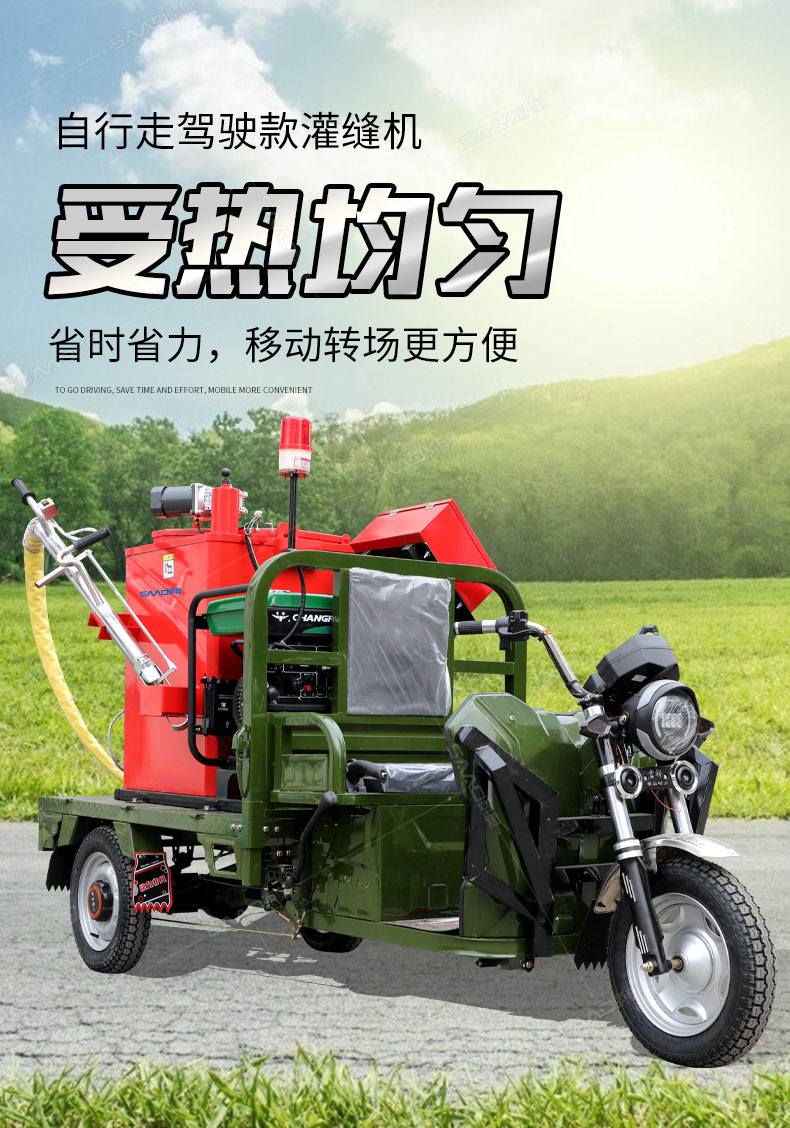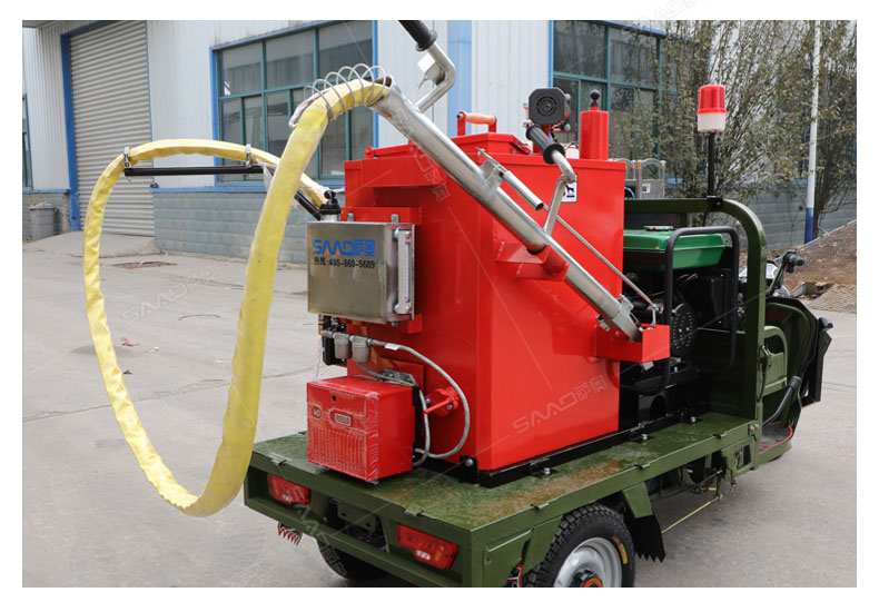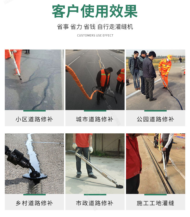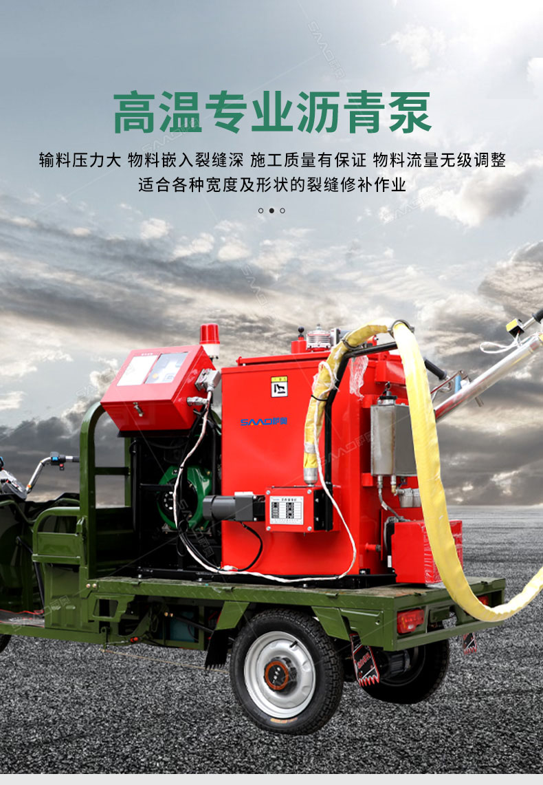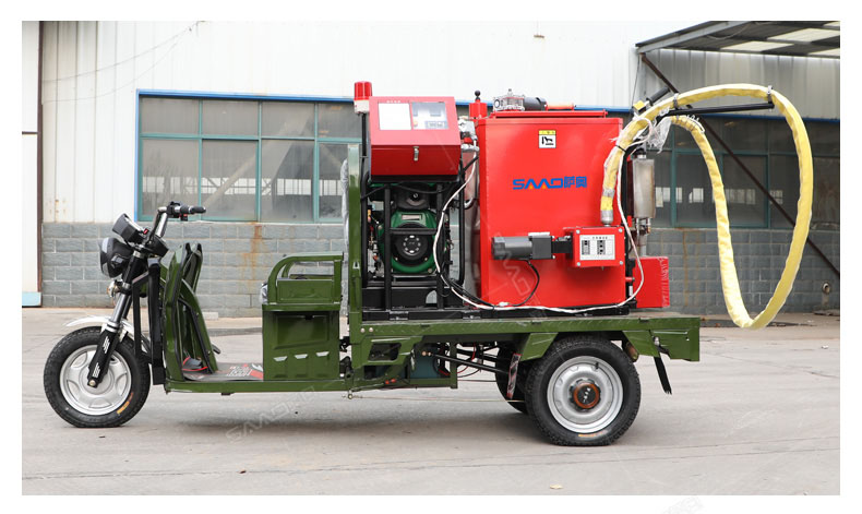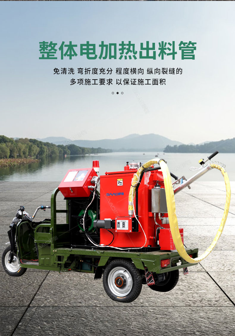 汽油灌縫機主要有手推式和自行式手持灌縫管操作,采用進口柴油燃燒器加熱。在工作時首先在料箱內加入瀝青或灌縫膠,啟動發電機供電,依次間斷打開導熱油泵開關,燃燒器開關,出料管加熱開關;調整自動溫控系統與材料的溫度相同,通過柴油燃燒器自動加熱熔料箱內導熱油開始升溫(拖式為強制循環)使材料融化,溫度是通過自控系統來控制。溶料時間大約30-40分鐘左右。在材料融化、出料管溫度達到后可以進行工作。手持灌縫管對正裂縫灌縫處理。瀝青泵的出料流量可調。在工作過程中隨時添加材料保證工作的連續性。