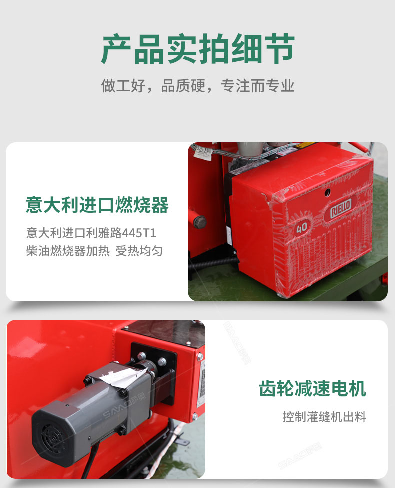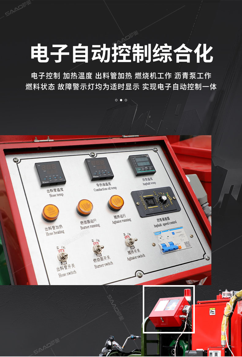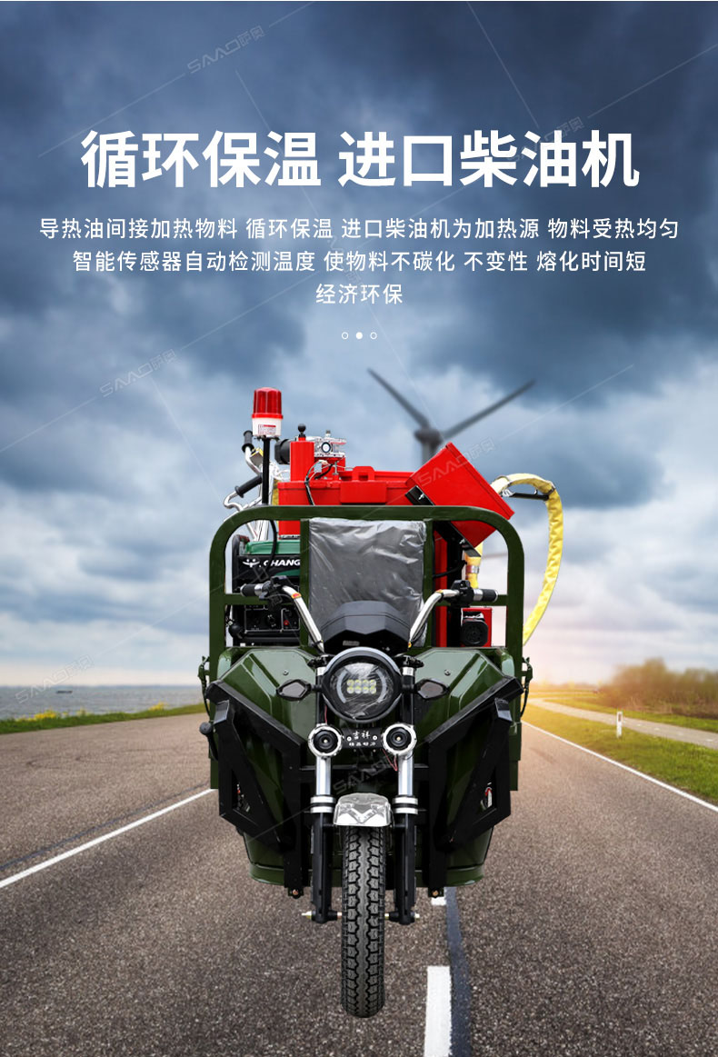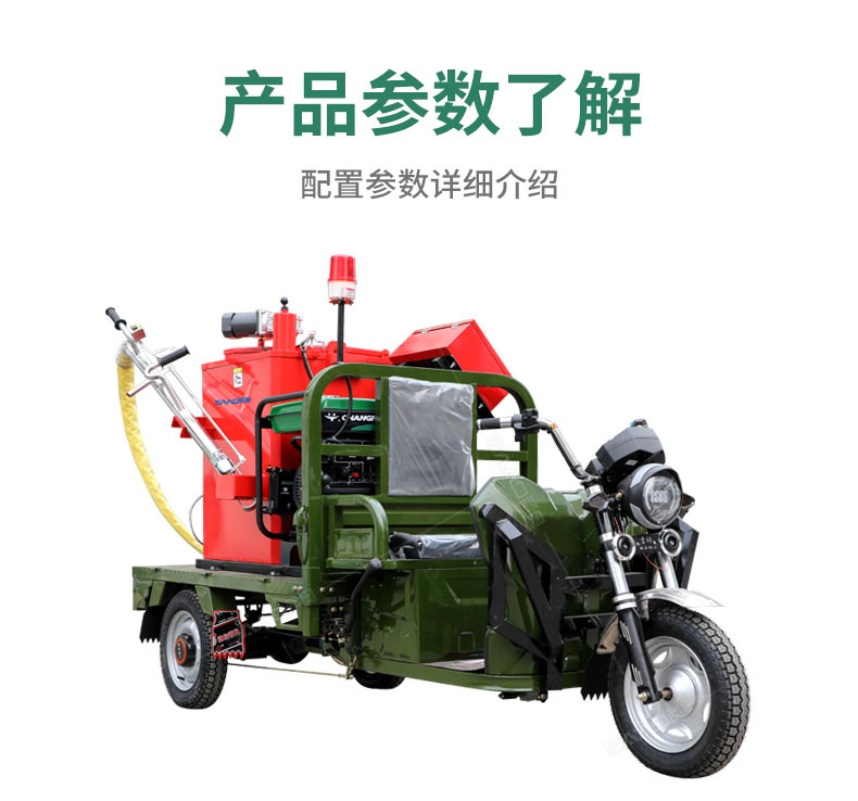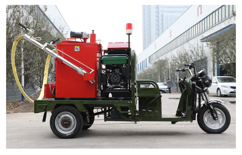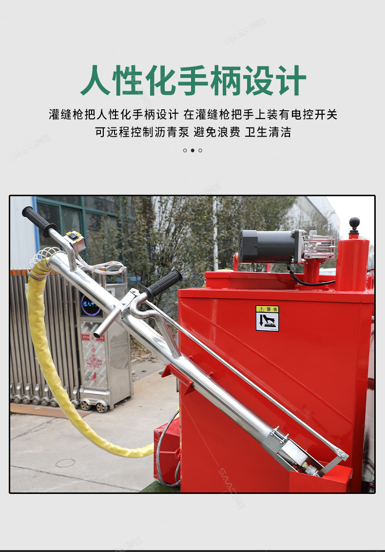 汽油灌縫機主要有手推式和自行式手持灌縫管操作,采用進口柴油燃燒器加熱。在工作時首先在料箱內加入瀝青或灌縫膠,啟動發電機供電,依次間斷打開導熱油泵開關,燃燒器開關,出料管加熱開關;調整自動溫控系統與材料的溫度相同,通過柴油燃燒器自動加熱熔料箱內導熱油開始升溫(拖式為強制循環)使材料融化,溫度是通過自控系統來控制。溶料時間大約30-40分鐘左右。在材料融化、出料管溫度達到后可以進行工作。手持灌縫管對正裂縫灌縫處理。瀝青泵的出料流量可調。在工作過程中隨時添加材料保證工作的連續性。