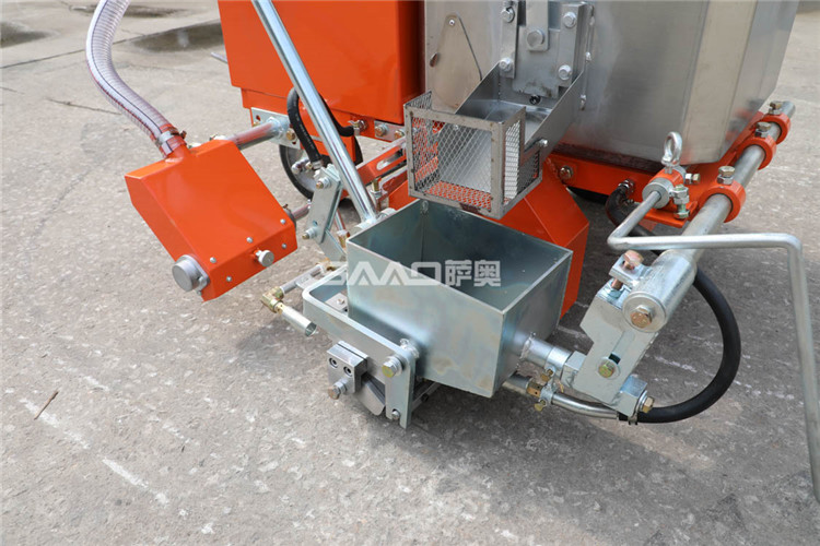 熱熔型標(biāo)線涂料在常溫下是固體粉末狀,施工時(shí),將涂料投入熔融釜中,邊熔化邊攪拌,待熔化呈熔融流動(dòng)狀態(tài)后,放入劃線車(chē)的保溫熔融料斗中。按設(shè)計(jì)圖標(biāo)明的涂敷位置上用下涂劑機(jī)涂敷底漆。待下涂劑干了之后,方能涂敷標(biāo)線涂料。開(kāi)始劃線時(shí),應(yīng)把劃線斗放在路面上,由于劃線斗與地面間有一定的間隙,當(dāng)劃線車(chē)前行時(shí),靠自動(dòng)流淌而刮抹出一條整齊的標(biāo)線。