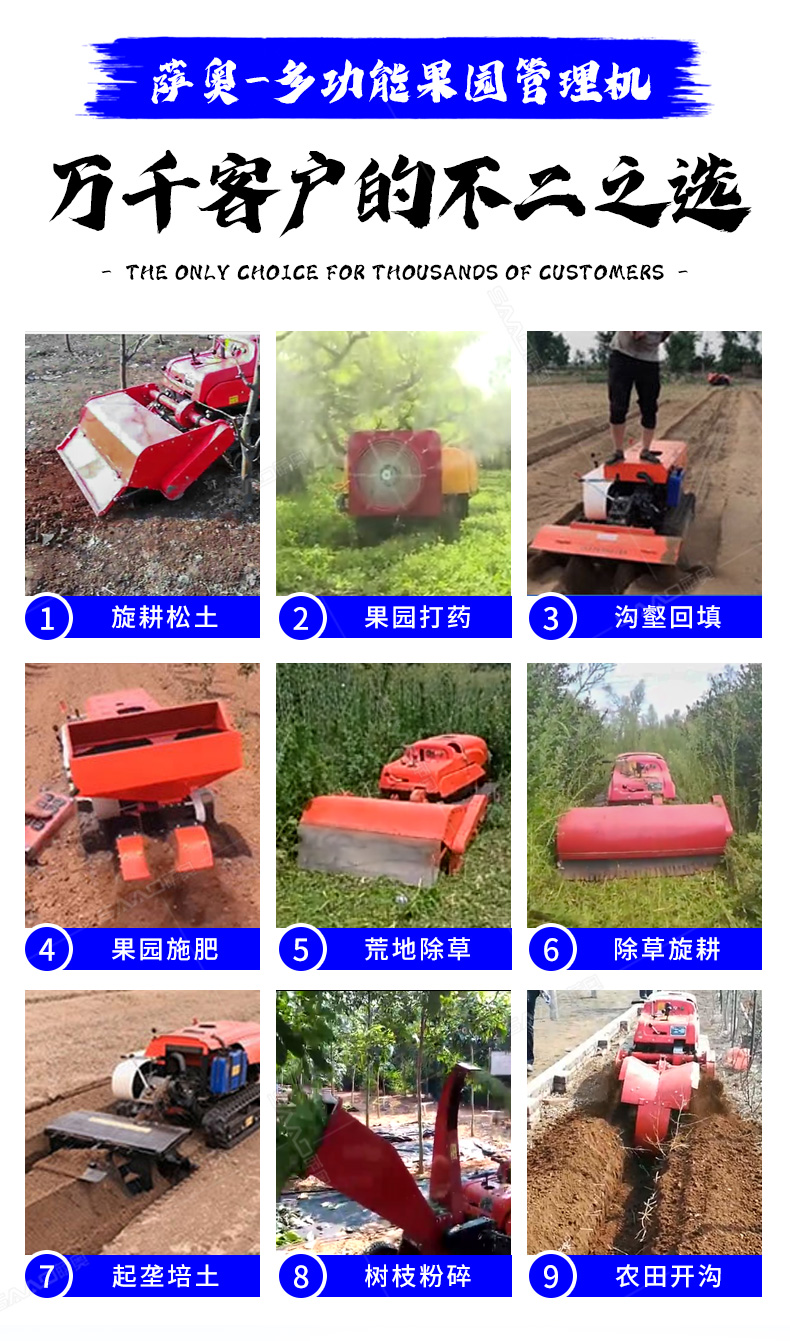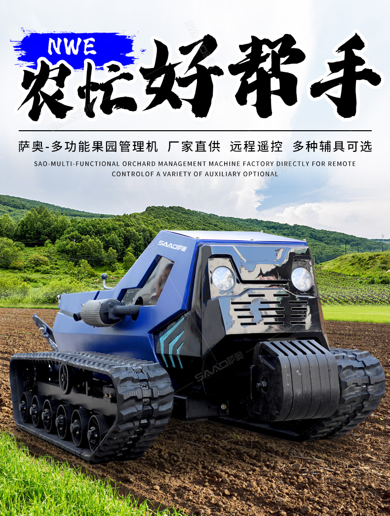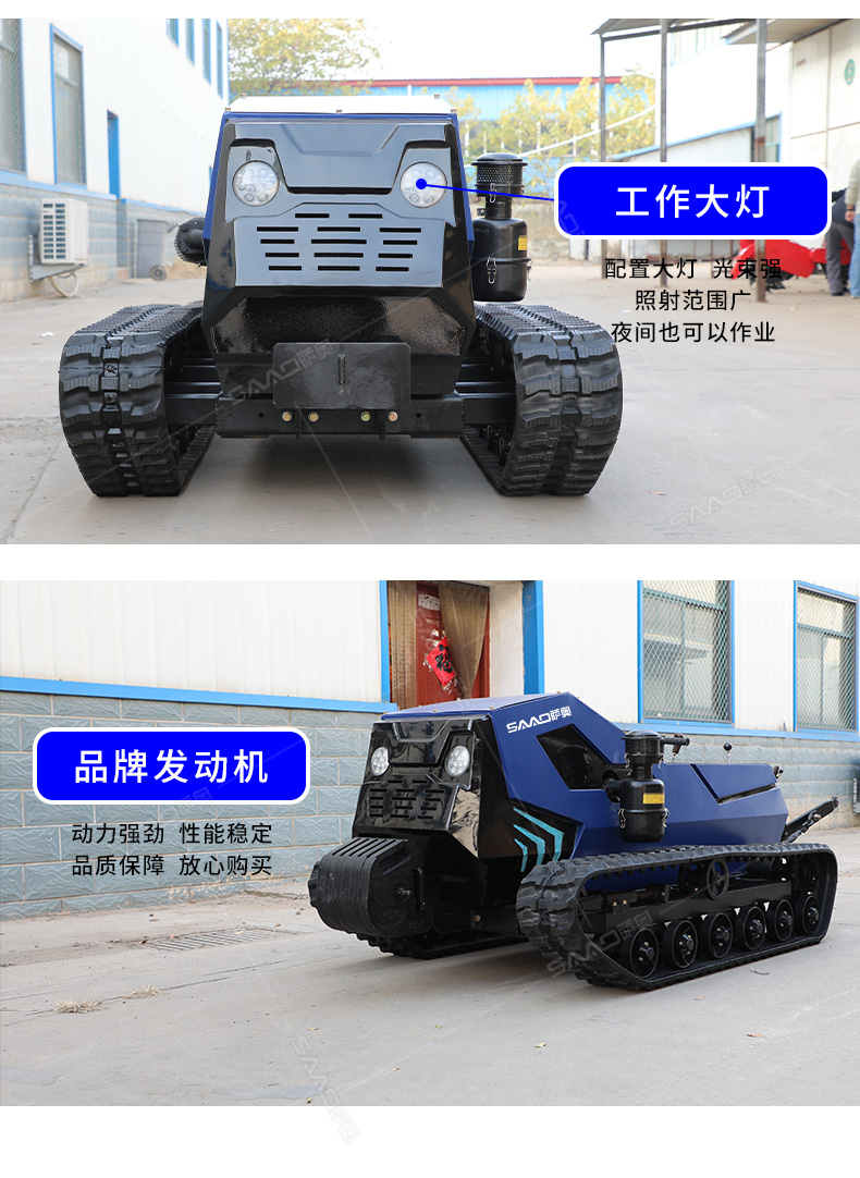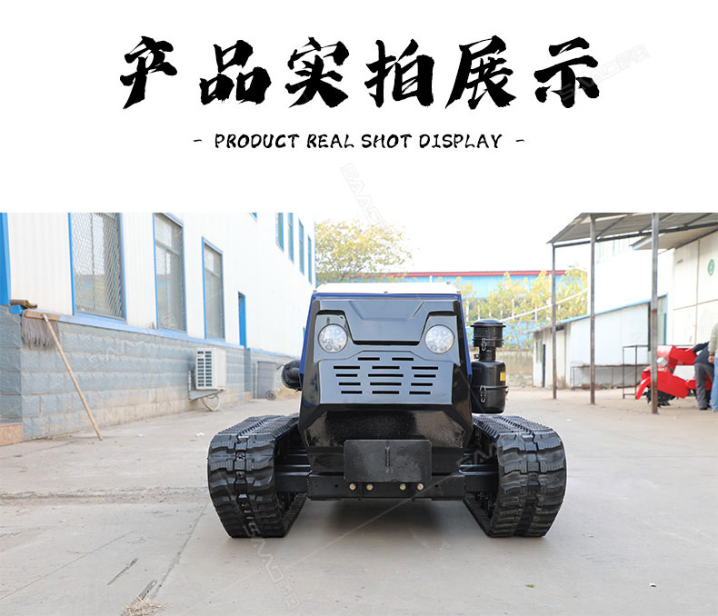 本產品采用履帶式驅動設計,穩定性和爬坡能力較強,適應丘陵山地平原各種地形,機型小功率大,適應各種行距的果樹,大棚,園林。產品動力強勁,結實耐用,性能優越,安全放心,遠程操控,省心省力。