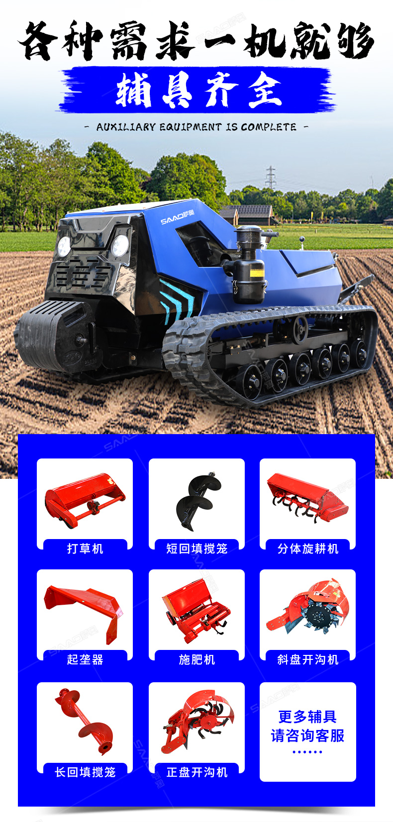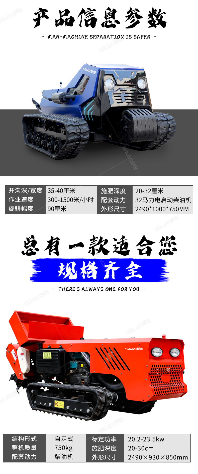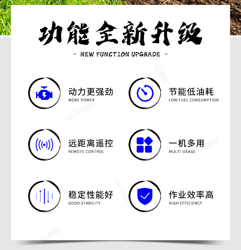 本產品采用履帶式驅動設計,穩定性和爬坡能力較強,適應丘陵山地平原各種地形,機型小功率大,適應各種行距的果樹,大棚,園林。產品動力強勁,結實耐用,性能優越,安全放心,遠程操控,省心省力。