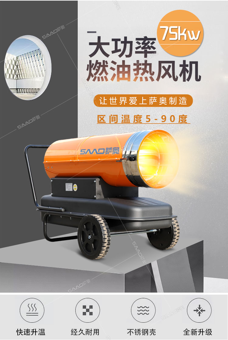 燃油暖風(fēng)機可控制區(qū)間溫度為5-90度,風(fēng)量更大,升溫更快,在木材的烘干等方面有巨大的功效,非常適合大面積的工業(yè)場所使用。
