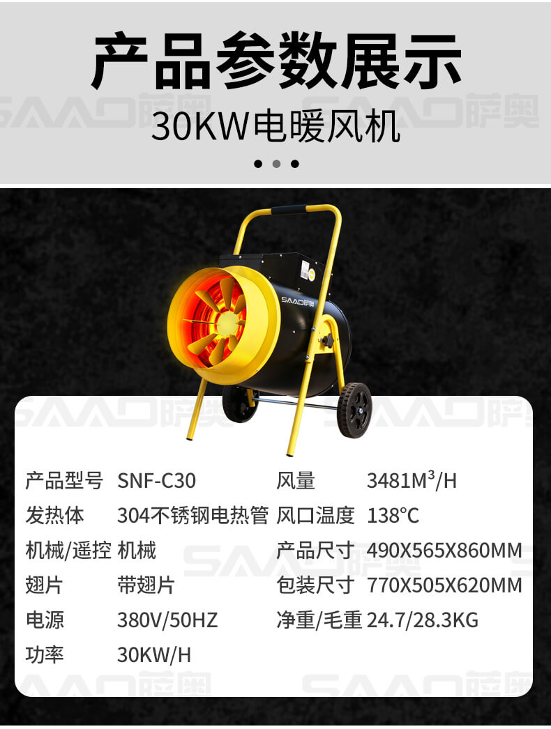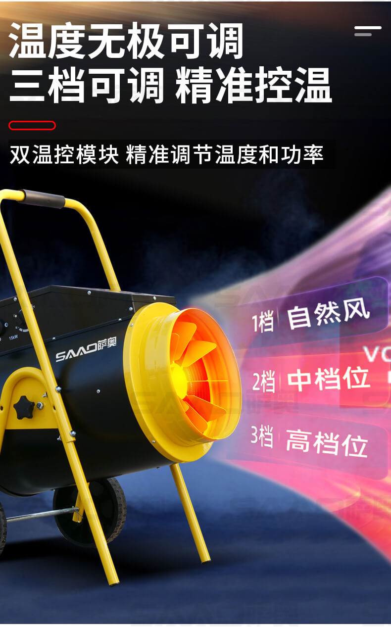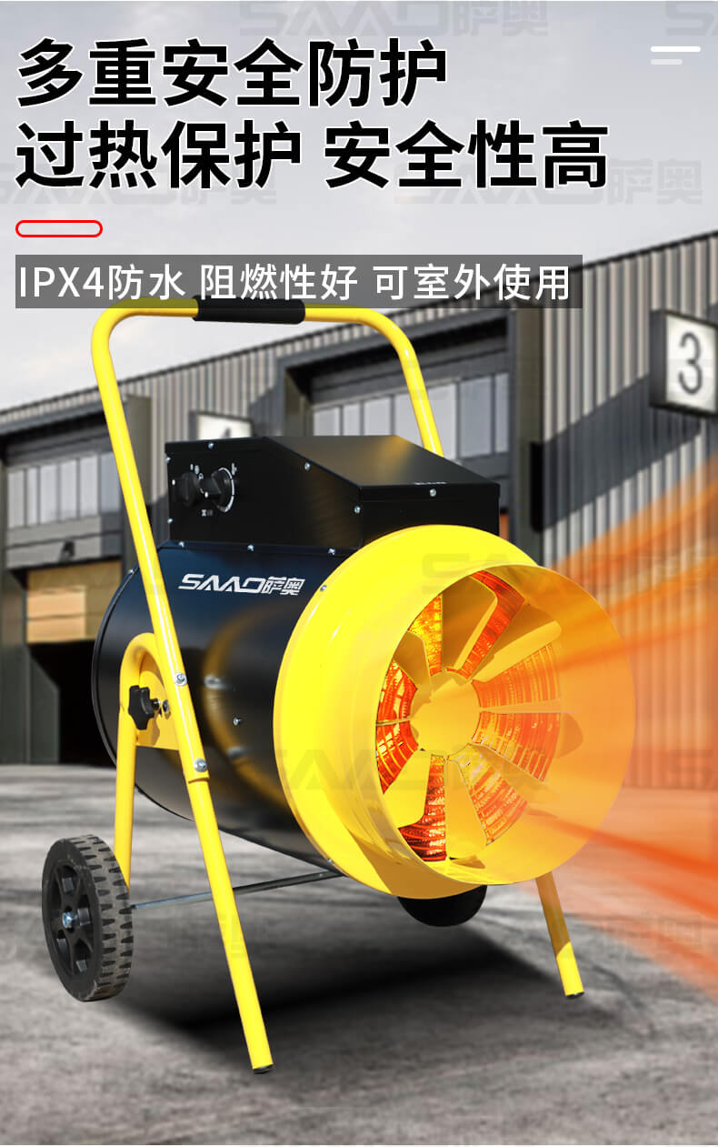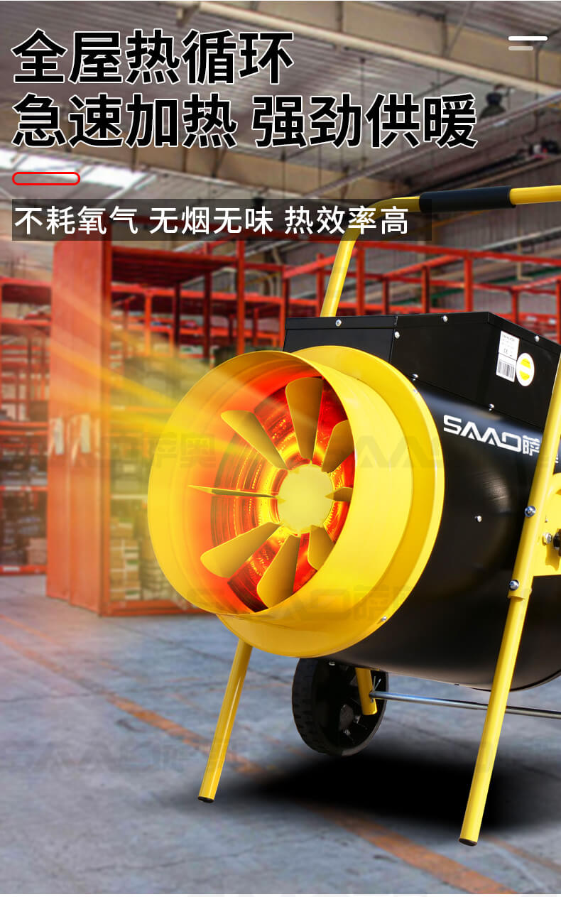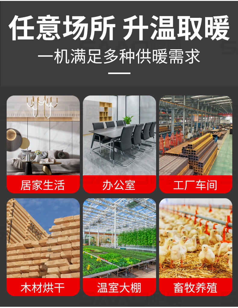 一款大功率、大面積使用的取暖設備,適合廠房、車庫、商店。辦公室、烘干室、養殖場等場所使用。