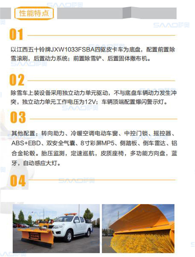 皮卡除雪車專用于市政、高速公路匝道、廣場、機場等區域掃雪、除雪及融雪撒布機等工作,空閑時候小型多功能除雪車可作為巡檢車使用,一車多用。